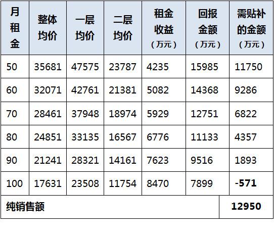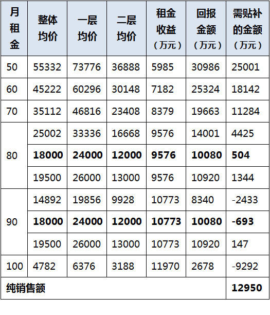 當(dāng)租金達(dá)到80元/㎡,商場(chǎng)整體銷售均價(jià)在18000元/㎡時(shí),發(fā)展商需貼補(bǔ)的金額最少,如果均價(jià)超過(guò)這個(gè)價(jià)格,則需貼補(bǔ)的金額也要相應(yīng)增加;
