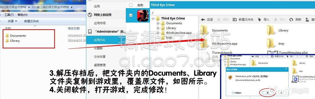 3、解壓存檔后,把文件夾內的Documents、Library文件夾復制到游戲里,覆蓋原文件,如圖所示。