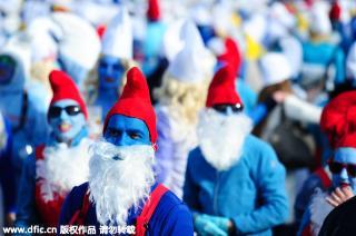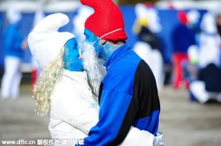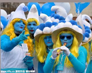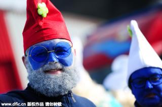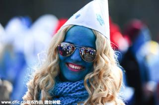 當(dāng)?shù)貢r(shí)間2016年2月6日,德國瓦爾茨胡特田根,人們扮成藍(lán)精靈的樣子參加藍(lán)精靈大會(huì)。Winfried Rothermel/東方IC