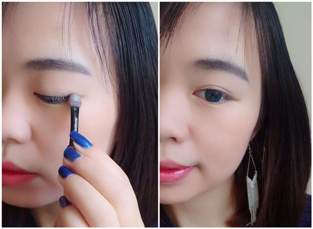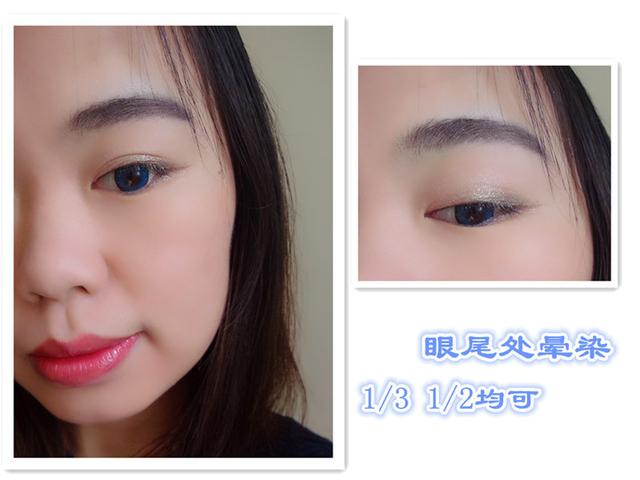 先用3號(hào)色從眼尾開始像眼頭暈染,暈染到2/3、1/2處均可,看個(gè)人喜歡,我一般是1/2處多一點(diǎn)~這款眼影略帶了點(diǎn)珠光,讓眼鏡有點(diǎn)blingbling的感覺(jué)!