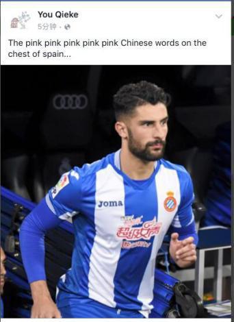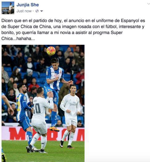 事件:皇馬與西班牙人的西甲聯(lián)賽,西班牙人身穿的球衣植入了超級女聲。