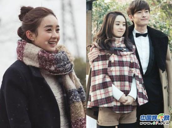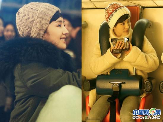 趙麗穎穿件黑色的大衣也會(huì)搭配彩色的圍巾,格子狀的小斗篷也是可愛至極。