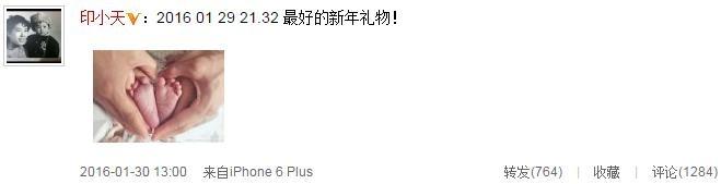 1月29日晚上21點(diǎn)32分,印小天喜得一子,體重將近7斤,并取名為“印斯明”。30日,印小天在微博分享了這一喜訊:“20160129 21.32最好的新年禮物!”并曬出自己陪護(hù)妻子生產(chǎn)的照片,以及夫妻倆抱著寶寶小腳丫的照片,看起來非常溫馨甜蜜。