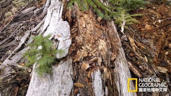 在岸邊的朽木上,云杉幼苗率先破殼而出。