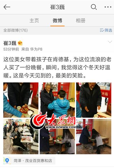 “這位美女帶著孩子在肯德基,為這位流浪的老人買了一份晚餐,瞬間,我覺得這個冬天好溫暖。這是今天見到的,最美的笑臉。”網友“崔3巍”在微博中這樣寫道,他告訴大眾網記者,今天菏澤最低溫度達到了零下14度,但當他看到這個瞬間時,感覺整個世界都溫暖了。于是,平時他一直熱心公益事業,看到這樣的感人瞬間,便隨手拍了下來,并通過網絡發布出去,“希望這樣的正能量能夠傳遞出去!