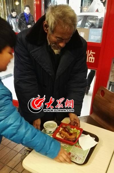 大眾網菏澤1月23日訊(記者張鵬)今天,菏澤大眾網網友“崔3巍”微博爆料,晚上7點多,他在菏澤銀座商場附近的肯德基餐廳,看到有一位女士端了一份肯德基套餐,給流浪漢吃。從照片中,大眾網記者看到,該流浪漢穿著破舊的大衣,頭發和胡子已經花白,一位女士端著一個托盤送到這個流浪漢的面前,托盤上是一碗湯和一份雞肉飯。