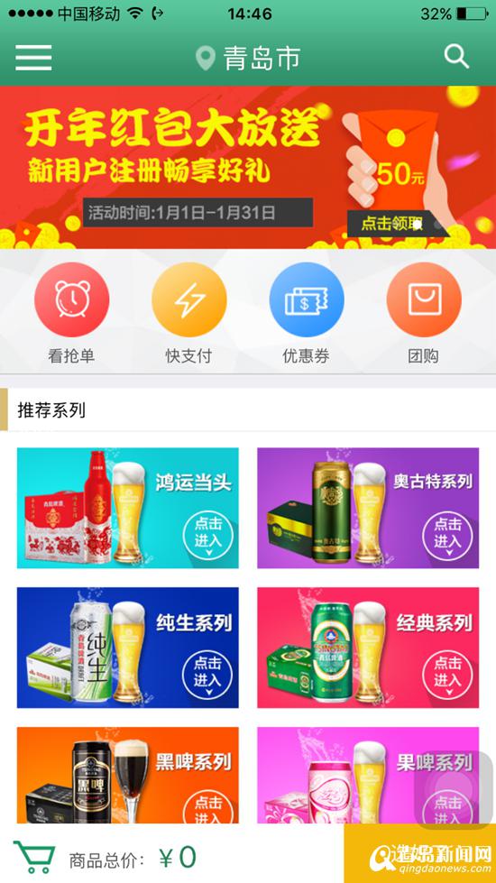 青島新聞網(wǎng)訊 金猴獻(xiàn)瑞,鴻運(yùn)當(dāng)頭。隨著春節(jié)腳步的臨近,青島啤酒不僅推出了鴻運(yùn)當(dāng)頭猴年紀(jì)念版產(chǎn)品,還有便捷的青啤快購(gòu)APP,讓你在家買啤酒,坐等鴻運(yùn)送上門,讓春節(jié)購(gòu)物變得省心、省力、省時(shí)、又省錢。現(xiàn)在就get√這個(gè)“新技能”給你,跟著青島啤酒鴻運(yùn)猴年紀(jì)念款鋁罐一起,搭上青啤快購(gòu)APP的快車,體驗(yàn)一次青島啤酒給我們帶來(lái)的速度與激情。