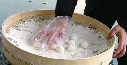 馬光亭曾做過調查,解放前,青島有相當一部分農村地區(qū)是不吃元宵的,但青島市區(qū)和一部分農村也能吃到元宵,“我姥爺解放前就從青島市區(qū)進元宵到膠南賣。 ”舊時,除了買元宵,也有人家自己做。與南方地區(qū)和好糯米面后將餡料包入面中的湯圓做法不同,青島人以前吃的元宵是“滾”出來的。就是將粉碎的熟花生米、芝麻、肉脂渣、糖等混合拌勻,再分成一個個的小劑子狀,這就是元宵的餡兒,簸箕里多是撒上黃米面,也有撒糯米面的,把餡兒放到面里,來回翻滾,直到表面粘上厚厚的一層面,元宵就算做好了。