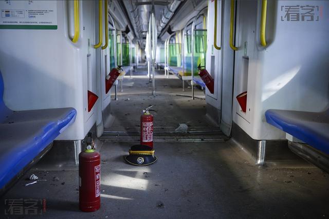 , 2015年8月13日,天津?yàn)I海東海輕軌站內(nèi),一輛因爆炸停駛的列車,列車員的帽子與滅火設(shè)備散落車廂內(nèi)。",