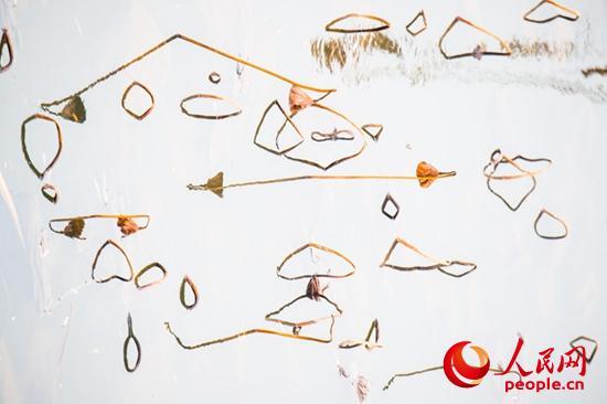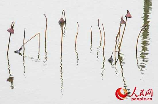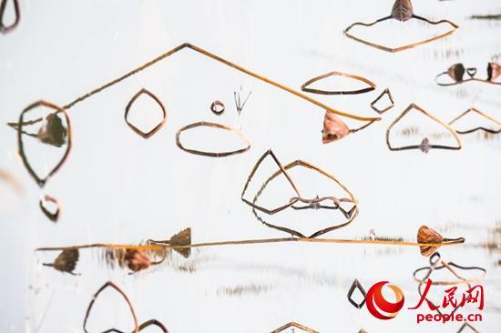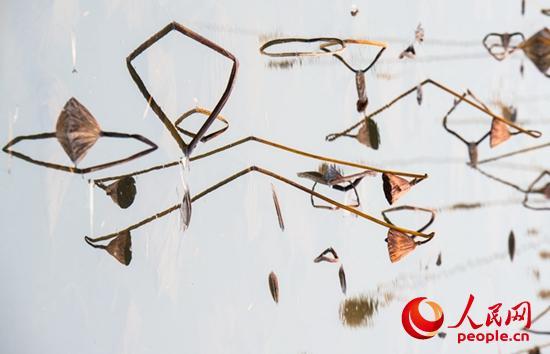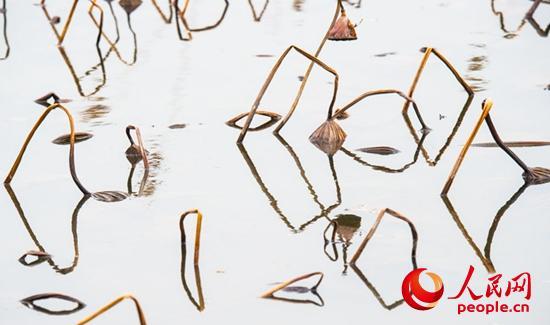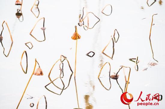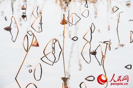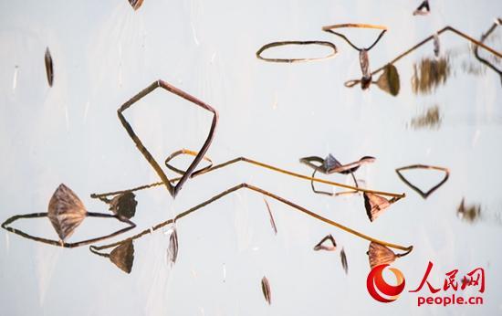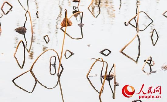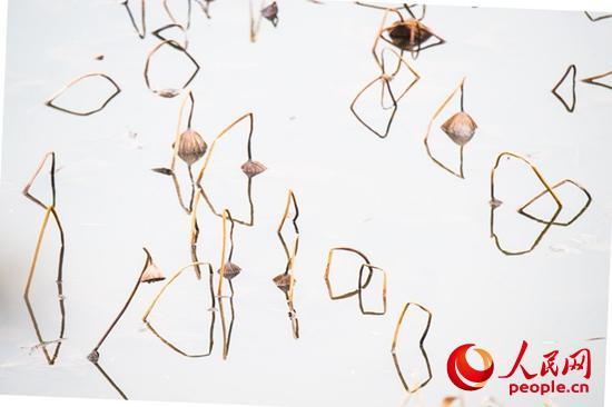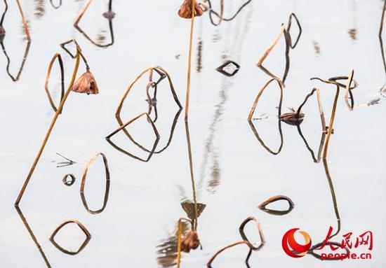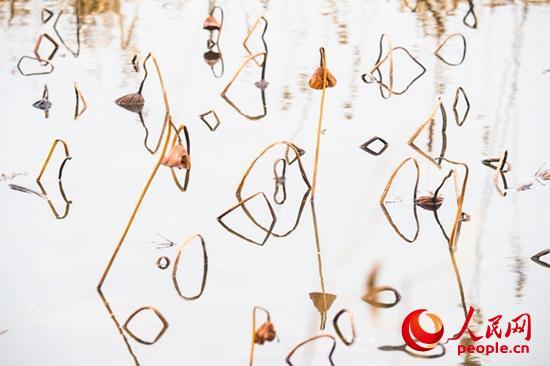 走進(jìn)她的世界,逆光觀瞻,與天空倒影相映,像是一幅幅水墨山水畫,或高或低、或遠(yuǎn)或近的干莛枯葉,構(gòu)成形形態(tài)態(tài)的幾何圖形,或三角形,或棱形,或橢圓,或心形,也有似英語(yǔ)字母,滿眼的A、B、C,還有OK。還像簡(jiǎn)筆畫,像瞪著大眼的玩皮熱帶魚,像受到驚嚇的烏賊。更像是中國(guó)畫的山石技法,也像是美女的臉頰,長(zhǎng)發(fā)飄逸,還戴著大大的三角耳環(huán)。這寧?kù)o水面光與影的構(gòu)圖,似古代帝王的舞場(chǎng),仕女張旗,歌舞拋袖,也似千軍萬馬的戰(zhàn)場(chǎng),撕殺正酣,沙土飛揚(yáng),只看到弓滿箭發(fā)、刀槍林立┅