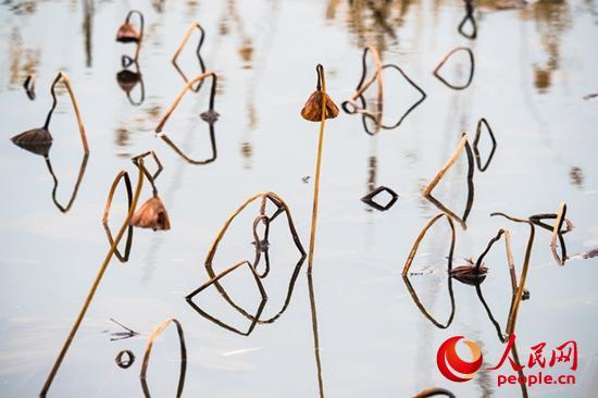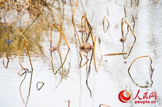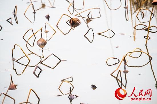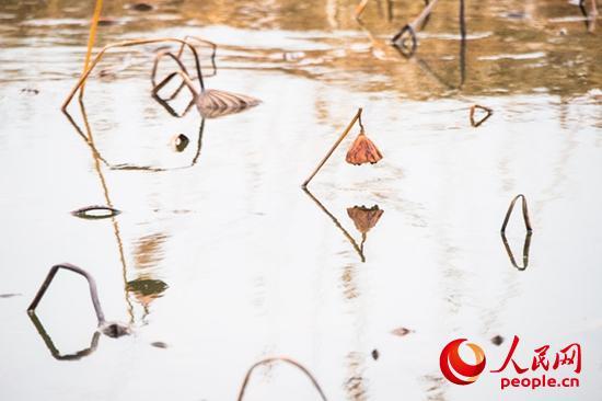 走進(jìn)她的世界,在陽(yáng)光下觀之,水面上干荷枯莛彎彎折折,亭亭而立,或直、或斜、或撲、或低頭、或仰望,間或有幾個(gè)彎著頭又黑又朽的老蓮蓬,多時(shí)三五個(gè),少有一兩個(gè),宛如風(fēng)鈴垂懸在莛上,堅(jiān)強(qiáng)不屈的挺立著。有幾張枯黃的荷葉,一半在水上,一半在水下,凌波而浴。在冬日輝映下被金銅色渲染,變成了一個(gè)個(gè)金器銅雕般的藝術(shù)品。