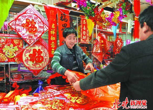 靳師傅在這里經(jīng)營了十多年,平日里他賣婚慶用品,只有過年的時(shí)候才會(huì)賣福字、春聯(lián)。因?yàn)橐肥辛耍崆皞浜昧诉@些年貨。回想起在天意經(jīng)營的這些年,靳師傅挺感慨的,從最初的紅火、興旺到受網(wǎng)店沖擊后的慘淡,他和同伴們都一一經(jīng)歷過。說起未來,靳師傅想回老家找找機(jī)會(huì),北京的小商品批發(fā)市場陸續(xù)外遷是趨勢,“我們也要順勢而為,否則咋賺錢呢?”