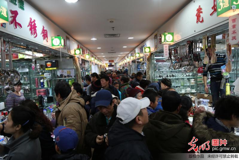 12月9日早上9點(diǎn),經(jīng)營(yíng)了14年的"小天意"不再像往常一樣對(duì)市民開(kāi)放,這個(gè)市場(chǎng)就要與街坊四鄰告別了。關(guān)門(mén)前的最后一天,地安門(mén)天意商場(chǎng)的老顧客依依不舍,商場(chǎng)內(nèi)外人頭攢動(dòng),摩肩接踵,,人山人海,關(guān)門(mén)前的最后一天堪比過(guò)年的廟會(huì)。