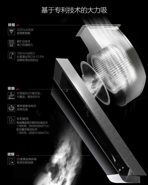 美的 DJ370R油煙機(jī)為升級(jí)版BIZE型葉輪,118mm大直徑,60片葉片,采用優(yōu)質(zhì)威靈電機(jī),運(yùn)行平穩(wěn),吸力增加約9%,專利蝸殼,等速螺旋增壓蝸殼風(fēng)道技術(shù)及航空翼型蝸舌技術(shù),能有效提高吸煙效果,55度傾斜角,攏煙更有效。