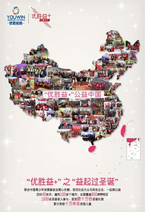 同年,優(yōu)勝教育將公益事業(yè)正式命名為“優(yōu)勝益+”,董事長(zhǎng)陳昊親自為項(xiàng)目定調(diào),旨在打造聯(lián)合社會(huì)各界力量關(guān)愛青少年的公益平臺(tái)。優(yōu)勝教育在2015年圣誕節(jié),聯(lián)合中國(guó)青少年發(fā)展基金會(huì),攜手社會(huì)知名企業(yè),組織以“送溫暖、送快樂”為主題的“益起過圣誕”暖冬公益行動(dòng)。該活動(dòng)歷時(shí)40天,走過100多個(gè)城市,全國(guó)覆蓋800余所校區(qū),1000多名圣誕老人參與,派發(fā)數(shù)十萬(wàn)份圣誕禮品,資助十萬(wàn)余名貧困兒童!