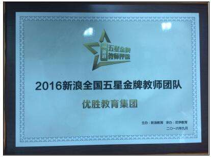 2016年9月21日,第六屆“新浪全國五星金牌教師評選”活動圓滿落幕。優(yōu)勝教育集團以絕對優(yōu)勢成功斬獲“五星金牌教師團隊獎”,兩名教師榮獲“全國五星金牌教師獎” ,多名教師榮獲“地方五星教師獎”。優(yōu)勝教育在整個行業(yè)內(nèi)的領(lǐng)軍地位再一次被同行業(yè)內(nèi)及家長學(xué)員所認(rèn)可。