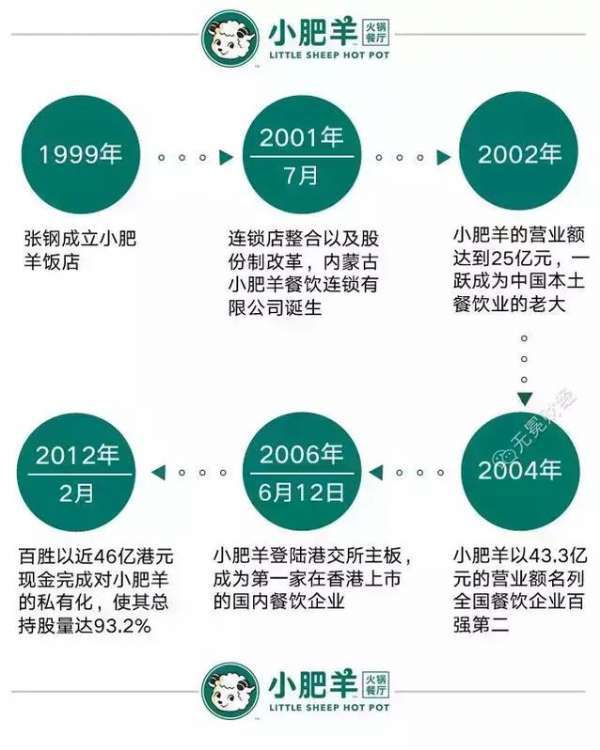 2004年,小肥羊以43.3億元的營業(yè)額名列全國餐飲企業(yè)百強第二,全國門店數(shù)量最高峰時達到721家。2006年6月小肥羊再下一城,首開國內(nèi)餐飲行業(yè)引進外資風(fēng)投的先河,引入3i和PraxCapital兩家私募基金共計2500萬美元投資。并于2008年6月12日登陸港交所主板,成為第一家在香港上市的國內(nèi)餐飲企業(yè)。