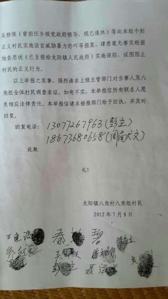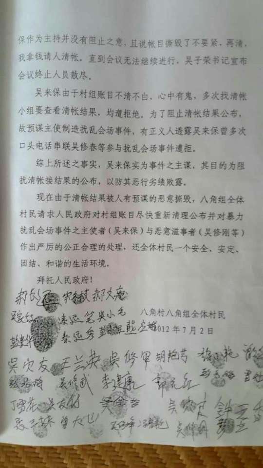 一,從2012年起本組村民就以聯(lián)名的形式向龍陽鎮(zhèn)舉報(bào)本組組長(zhǎng)(時(shí)任本村支部副書記,主管國(guó)土)吳來保有關(guān)違法違紀(jì)的實(shí)事,但我們的舉報(bào)有如石沉大海,一直到現(xiàn)在龍陽鎮(zhèn)都沒有一個(gè)合理的回復(fù)與處理結(jié)果,以圖不了了之,息事寧人,期間本組村民多次找鎮(zhèn)領(lǐng)導(dǎo)請(qǐng)求處理均無果而終。