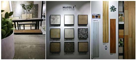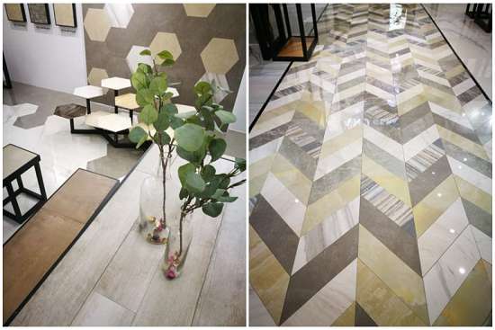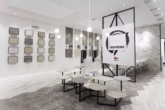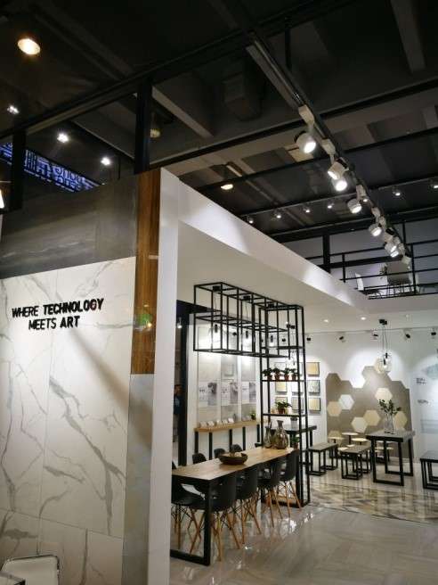 另外,此次廣交會產(chǎn)品展示更豐富,市場指向也更明確,目標客戶體驗感及認同感更強。整體設計上偏向歐洲的簡潔風格,同時有做些許微調(diào),使得亞洲客戶更能接受。產(chǎn)品展示上,除了鋪貼在地面及墻面,同時也切割成瓷磚式的桌子及凳子,讓整個展示空間更顯得生活化同時兼具趣味性。