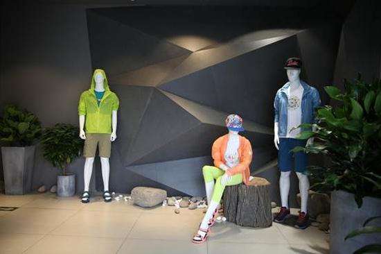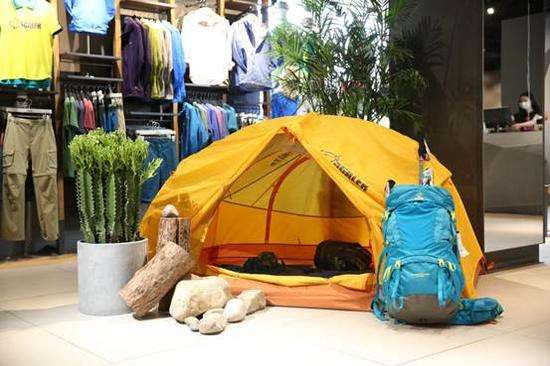進(jìn)門后,原來的兩個可以移動的大木箱已被寬曠的露營生活的場景替代,專業(yè)的高山帳、60L的大背包、登山杖和山石、綠植一起,栩栩如生地構(gòu)造出一幅戶外露營生活的畫卷。“我們希望用這樣的場景來喚起大家更多戶外生活的共鳴!”場景之外,是思凱樂當(dāng)季的產(chǎn)品系列,安靜地在墻面貨架上,以不同的色彩和款式期待著一場知遇的旅程。