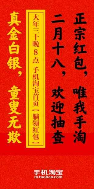 為了融入這新“習(xí)俗”,唐獅作為時尚休閑服裝品牌也起表率作用,率先聯(lián)手手機淘寶給全民發(fā)紅包,據(jù)悉紅包金額超過百萬,并且都是真金白銀。這次推出紅包活動是春節(jié)對消費者的回饋,希望通過以應(yīng)景的春節(jié)紅包為載體,加強和消費者彼此之間的溝通,給消費者更直觀的消費體驗。從手機淘寶躺領(lǐng)紅包活動將于