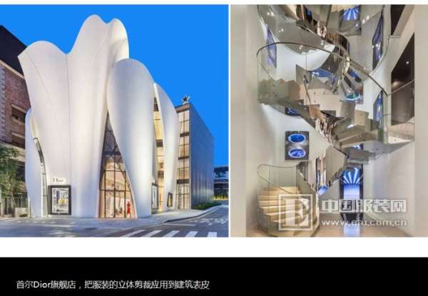 這個是韓國首爾迪奧的專賣店,它整個的建筑設(shè)計,外面的和室內(nèi),我個人認(rèn)為是非常有科技感的一種結(jié)合,非常的漂亮。這是現(xiàn)在不得不提3D打印技術(shù),這是3D打印快閃店,3D打印快閃店的一個,可以組裝、可拆卸,非常輕便,非常環(huán)保,這是一個我們看到,現(xiàn)在3D很廣泛應(yīng)用,包括服裝上。但是我個人看了,還是一個嘗試階段,還沒有達到我個人剛才提的觀點,就是它能夠和服裝、和時尚能夠更完美的結(jié)合,或者說這不僅僅是日常的生活穿著的需求,我覺得它除了這種藝術(shù)審美之外,不能被日常審美接受,應(yīng)該說還是在嘗試階段。這個像3D打印一樣,我相信通過五年,十年以后,一定會在服裝或者在這個時尚這個領(lǐng)域,能夠更美好,更完美的結(jié)合。那這些東西,我相信作為一個時尚專業(yè)領(lǐng)域的學(xué)生需要去了解,需要去涉獵,至少我們要知道世界發(fā)生了什么樣的變化,出來一些什么新的東西。
