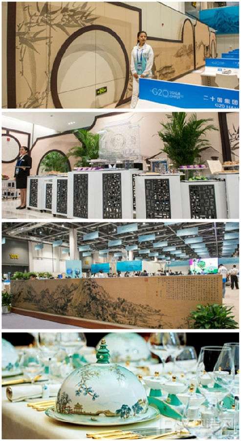 G20杭州峰會(huì)是中國近年來主辦的級(jí)別最高、規(guī)模最大、影響最深遠(yuǎn)的國際峰會(huì),吸引了全球約70個(gè)國家的近5000名媒體記者齊聚西湖報(bào)道峰會(huì)盛況。為了向外國媒體展示悠遠(yuǎn)的中國歷史及深厚的城市文化,此次G20峰會(huì)處處可見中國元素,處處洋溢中國風(fēng)!座無虛席的G20杭州峰會(huì)新聞中心以柔和廣闊的藍(lán)色為主調(diào),映襯著峰會(huì)志愿者“小青荷”主題服裝的西湖群山與西湖湖水。公共工作區(qū)內(nèi)用元代畫家黃公望的巨作《富春山居圖》的噴繪裝飾圍擋,這幅位列中國十大名畫之首的絕世佳作是杭州向外賓展示的第一張名片。在茶歇區(qū),繪有拱橋、山水、竹葉的屏風(fēng)古典素雅,中國剪紙風(fēng)格茶桌古色古香,濃濃的古韻恰如其分地點(diǎn)綴在每一個(gè)角落。當(dāng)日下午,在為二十國領(lǐng)導(dǎo)人精心準(zhǔn)備的G20西湖盛宴上,名為“國色天香”的國宴瓷器配以國花牡丹,雍容華貴;而裝飾著荷花、和田玉的桌布則寓意著和和美美。這一席極具江南韻味的盛宴向世界傳遞著中國氣派。