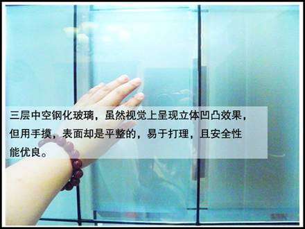 玻璃材質(zhì)選用三層中空鋼化玻璃,雖然視覺上呈現(xiàn)立體凹凸效果,但用手摸,表面卻是平整的,易于打理。另外鋼化玻璃安全性能好,家里有小孩卻又喜歡玻璃裝飾的家長不用擔(dān)心,即使是孩子不小心打碎了玻璃,也不易傷到人。
