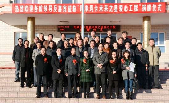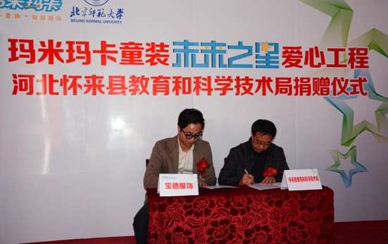 11月19日,中國十大童裝品牌瑪米瑪卡“未來之星愛心工程”走進河北懷來縣-中國人民英雄董存瑞的故鄉(xiāng),在懷來縣存瑞中心學校舉行捐贈儀式,出席此次捐贈儀式的領(lǐng)導有張家口市教育局副局長陳紅梅女士、張家口市捐資助教科科長衛(wèi)升高先生、懷來縣教育和科學技術(shù)局局長安國強先生、北京師范大學國內(nèi)合作辦公室教育發(fā)展中心副主任遲超智先生、瑪米瑪卡總部品牌總監(jiān)江志敏先生、瑪米瑪卡北京分公司經(jīng)理李消女士、瑪米瑪卡張家口市經(jīng)銷商陳秀麗女士、以及懷來縣接收捐贈的27所農(nóng)村學校的校長和媒體記者。據(jù)悉,這是繼走進“內(nèi)蒙古大草原”之后,瑪米瑪卡本年度“未來之星愛心工程”舉行的又一次大型捐贈公益活動。據(jù)了解,瑪米瑪卡童裝此次公益行動將分別向河北懷來縣教育和科學技術(shù)局27所農(nóng)村學校,捐贈物資價值760000元的運動服裝及愛心運動裝備。