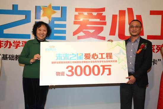 當(dāng)“陽光體育活動(dòng)”的號(hào)角在神州大地全面吹響,為了響應(yīng)教育部、國(guó)家體育總局、共青團(tuán)中央聯(lián)合頒發(fā)的《關(guān)于全國(guó)億萬學(xué)生陽光體育運(yùn)動(dòng)》的決定,福建寶德集團(tuán)旗下“瑪米瑪卡”童裝品牌與教育航母北京師范大學(xué)聯(lián)合發(fā)起了“未來之星愛心工程”公益活動(dòng)將歷時(shí)五年,行程覆蓋全國(guó)各個(gè)省份,上千所學(xué)校,捐贈(zèng)總價(jià)值約為3000萬元的運(yùn)動(dòng)服裝及用品,為全國(guó)各級(jí)學(xué)校推進(jìn)陽光體育活動(dòng)提供物質(zhì)支持。瑪米瑪卡與全國(guó)各地教育局、學(xué)校共同關(guān)愛青少年健康教育的新平臺(tái)!