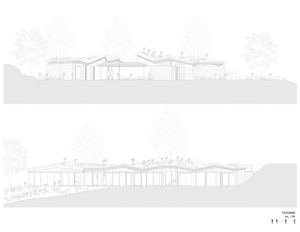 住宅的社交單元面向東部,房間單元面向西部,并由通道中樞連接,中樞與兩個單元之間的外部空間有關(guān)。一系列覆蓋著植被的褶層讓人聯(lián)想起山脈的運動,形成內(nèi)部的空間。