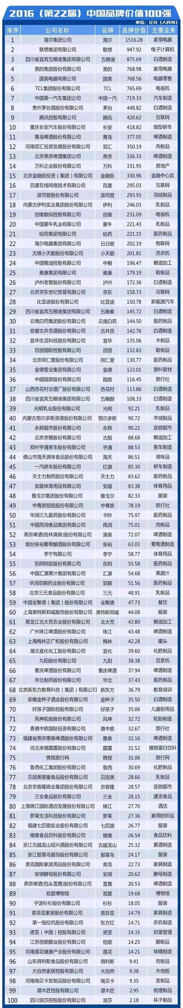 2016中國品牌價(jià)值100強(qiáng)