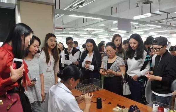雅瑩總部的供應(yīng)鏈制造工場(chǎng)分為精品工場(chǎng)、外套工場(chǎng)、連衣裙工場(chǎng)、裙褲工場(chǎng),嘉賓們進(jìn)入車間,見(jiàn)到了整齊碼放的各種零布料。雅瑩的工匠精神,在整個(gè)精品工場(chǎng)中隨處可見(jiàn),許多擁有幾十年技藝的老師傅穿針引線,現(xiàn)場(chǎng)縫制衣料,那些看似不經(jīng)意的領(lǐng)口袖口,都是老師傅純手工縫制。一件小小的衣領(lǐng)釘珠,一個(gè)師傅一天只能縫制三件。