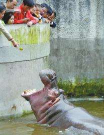 成都動(dòng)物園,幾位市民用橘子皮喂河馬。 (資料照片)