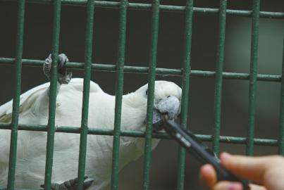 成都動(dòng)物園,一位游客用圓珠筆挑逗鸚鵡。