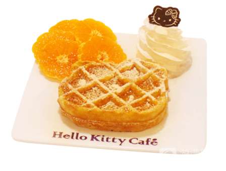 Hello Kitty咖啡館(弘大店)提供飲料和蛋糕。在花式拿鐵中,會用咖啡拉花做出可愛Kitty的圖案。蛋糕、華夫餅等都是做成Kitty的形狀,可愛得讓人不忍心吃下肚。