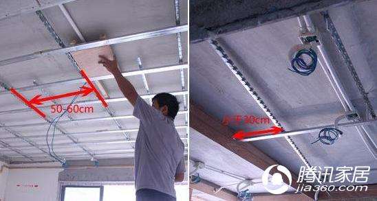 龍骨布置:安裝鋁扣板的尺寸布置龍骨位置,一般兩龍骨之間的間距為50-60cm,吊桿距離主龍骨端部不超過30cm,否則需要增設吊桿。
