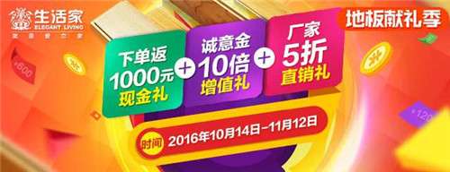 有一種活動叫“地板獻禮季”;有一種勁爆叫豪禮享不停、驚喜全天有;有一種震撼叫新品來襲、折上折;有一種期待叫全城惠動、一促即發(fā)。生活家地板“地板獻禮季”感恩特惠提前引爆,驚喜豪禮全天開啟,讓你提前享受雙11,你準(zhǔn)備好了嗎?
