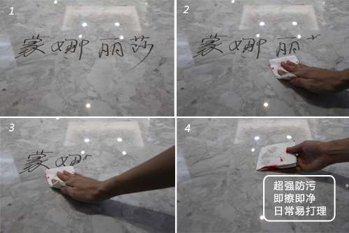 對(duì)于瓷磚來說,每天都會(huì)接觸各式各樣的灰塵和雜漬,如果抗污性差,必定對(duì)日常的保養(yǎng)與清潔產(chǎn)生極高難度,同時(shí)也會(huì)影響用戶的使用效果與使用體驗(yàn)。小編通過用油性筆往瓷磚磚面上寫字的方法測試發(fā)現(xiàn),只需用紙巾輕輕擦拭就能將字跡輕松地處理干凈,完全不需要任何洗滌劑,可見這款產(chǎn)品的防污性好。