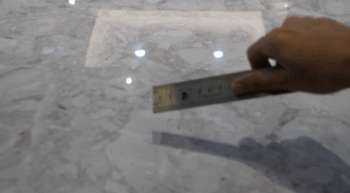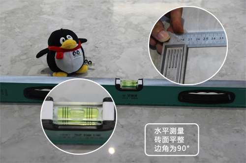 小編現(xiàn)場將水平測量儀放置磚面上,發(fā)現(xiàn)水平氣泡觀察窗中的氣泡居中,沒有超過兩邊標(biāo)準(zhǔn)線,證明該薄磚平整度相當(dāng)高。同時(shí),用直角尺對(duì)瓷磚邊角測量發(fā)現(xiàn)角度為90°直角。