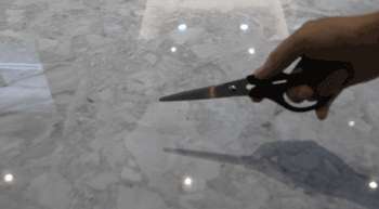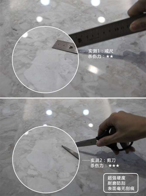 在實(shí)際使用中,瓷磚經(jīng)常會(huì)受到不同程度的摩擦,可能會(huì)產(chǎn)生刮痕。為測試這款羅馬寶石的耐磨性,小編分別用戒尺和剪刀在瓷磚表面用力劃刮,發(fā)現(xiàn)磚面沒有任何刮痕,依然光滑如新,可見這款羅馬寶石十分堅(jiān)硬耐磨。