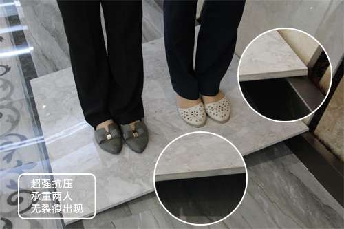 瓷磚的抗壓性能會(huì)影響瓷磚的使用壽命,瓷磚的承重性能很好地說明瓷磚的硬度與結(jié)實(shí)程度。小編將這款羅馬寶石瓷磚傾斜放置,2名成年人站在瓷磚中部位置,瓷磚不見有任何打滑以及破裂現(xiàn)象,證明瓷磚的抗壓能力同樣十分優(yōu)秀。