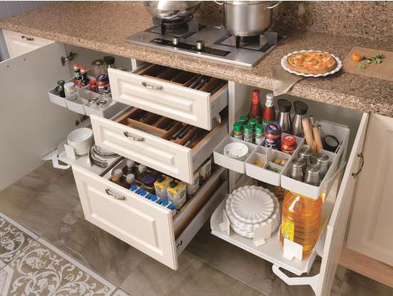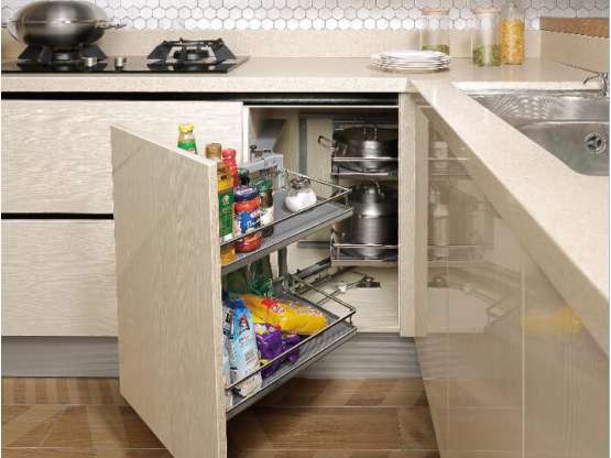 在櫥柜轉(zhuǎn)角處設(shè)置拉籃,可以最大程度利用死角空間,輕拉輕推之間就可以擴(kuò)充廚房面積。無(wú)論是轉(zhuǎn)動(dòng)籃架還是抽拉活動(dòng)式的雙層收納都能夠極大地?cái)U(kuò)充廚房空間。