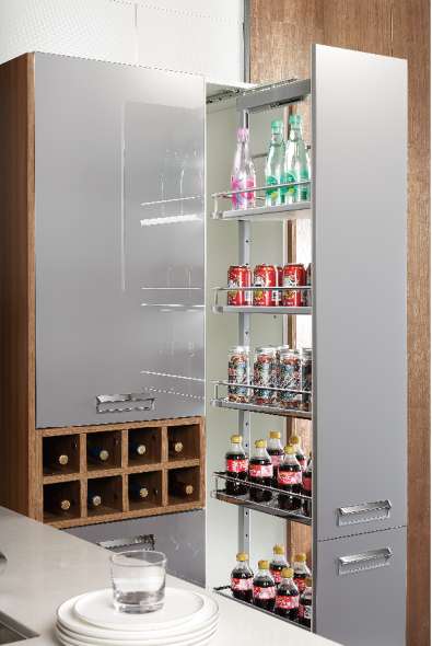 豎長(zhǎng)的窄形拉籃,其狹長(zhǎng)的儲(chǔ)物空間非常適合存放灌狀或瓶狀的物品。富有層次的抽拉式側(cè)面窄抽屜,將櫥柜的角落空間利用起來(lái)。