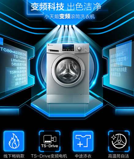 08年初,美的公司對小天鵝進行了控股。這款小天鵝 TG80-1229EDS 洗衣機,8公斤洗滌容量,采用 TS-Driver 變頻電機,更加靜音穩定;翼式提舉筋強化摔打效果,搭配最高90度的獨立水溫控制,1200轉甩干轉速,清潔效果更好;帶有90度高溫自潔功能,更加清潔衛生;并有15中預設洗滌程序,可以180度開門,支持中途添衣、超凈漂洗、清理去污等功能。符合國家一級能效,額定功率1800W。8公斤大容量,變頻一級能效,功能也齊全,對于一般家庭來說完全足夠。