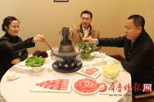 三名客人圍著東來順特有的景泰藍(lán)火鍋品嘗正宗內(nèi)蒙羊肉