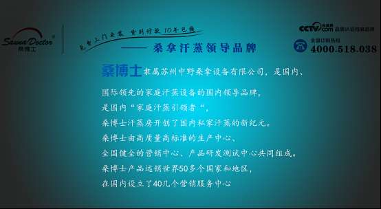蘇州中野桑拿設備有限公司——我國專業(yè)設計、生產(chǎn)、銷售系列養(yǎng)生設備的高新技術(shù)企業(yè),其負責人介紹:他們研發(fā)生產(chǎn)的桑博士遠紅外家用汗蒸房系列,包括單人、雙人、多人等多種型號,安全方便、外形美觀,產(chǎn)品遠銷歐美50多個國家和地區(qū),目前在國內(nèi)也越來越受家庭用戶的青睞,成為一種時尚健康的消費潮流。