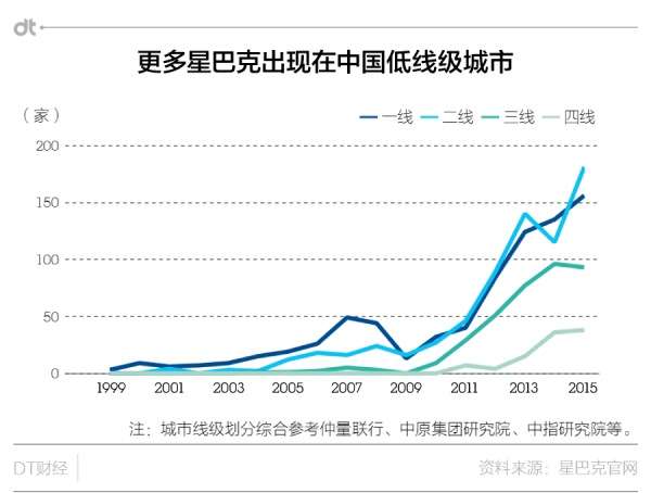 其次,從新辟市場來看,星巴克過去5年正迅速攻占一大波三四線城市。