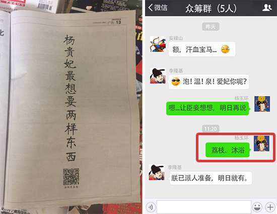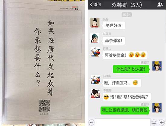 2016年10月15、16、17日三天,一則《唐朝眾籌》的懸念刷爆南方都市報頭條,是誰擲重金豪包南都報三天頭版?15日,“如果在唐朝發(fā)起眾籌,你最想要什么”的問話一登出,話題熱度瞬間飆升,引發(fā)網(wǎng)友熱議——李白說想要絕世好酒,好酒配好詩;白居易想要品茶彈琴,悠哉悠哉;李隆基想要的是泡溫泉!那么楊貴妃呢?網(wǎng)友們紛紛猜測貴妃想要的是金銀財寶與皇后之位;更有網(wǎng)友大膽猜測貴妃想要的是LV、香奈兒、迪奧、圣羅蘭、蘭博基尼、法拉利......果然是腦洞大開!但“唐朝眾籌”背后究竟蘊藏著什么?
