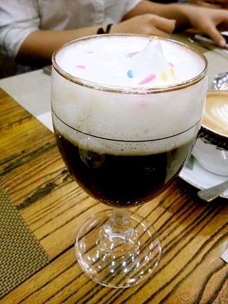 左圖是情人的眼淚,里面是加了一種酒調(diào)的,喝起來會(huì)有一點(diǎn)酒精那種辣的感覺,本人覺得味道還是挺好的。據(jù)店長介紹,這款咖啡有個(gè)凄美的愛情故事,說是稍后再講,結(jié)果就沒有稍后了……店長忘記講了,到底是個(gè)多么凄美的故事,大家去吃的時(shí)候問店長吧。右圖為塞納左岸,黑咖啡,真是苦,加了奶和糖還是苦,不過這也是黑咖啡的特點(diǎn)。